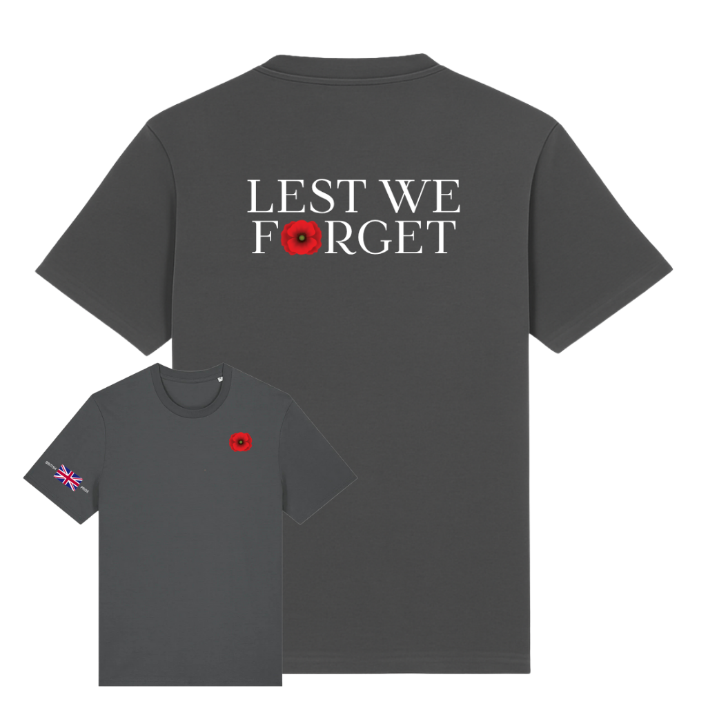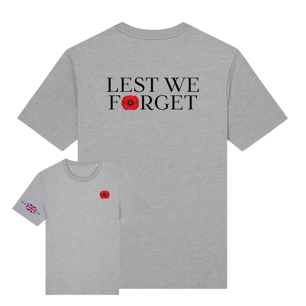 The Lest We Forget Tee is a solemn and stylish homage to the heroes who gave everything. Featuring a single red poppy on the front chest, this design keeps it simple, symbolic, and deeply meaningful. On the back, bold lettering reads “Lest We Forget” — a timeless message of remembrance and gratitude. Adding to its patriotic detail, the right arm proudly displays a British flag flanked by the words “British Pride” on either side, honoring heritage and unity with every wear.