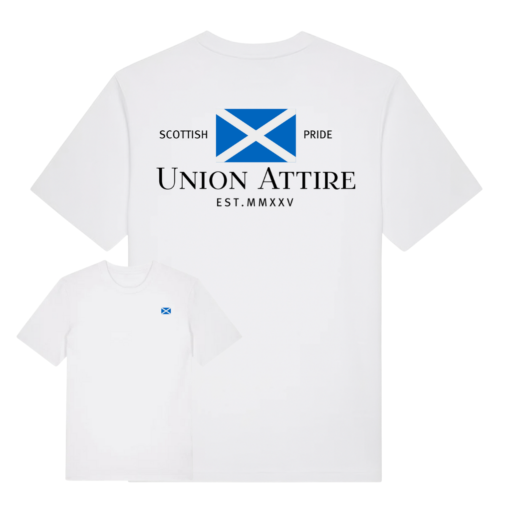 Wear your roots with pride. This classic t-shirt places the Scottish flag over your heart and showcases a striking logo on the back, reimagined in national colors!